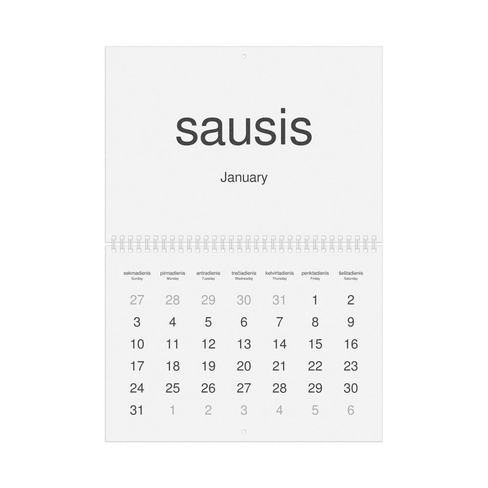 2026 Wall Calendar, Lithuanian/English-Labeled, Sunday-Start Layout, Wire-Bound, 11.7 x 8.3 in (29.7 x 21.0 cm)