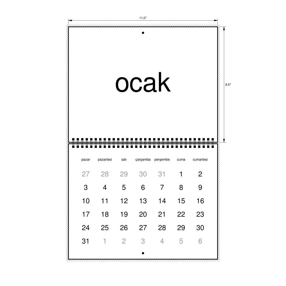 2027 Wall Calendar, Turkish-Labeled, Sunday-Start Layout, Wire-Bound, 11 x 8.5 in (27.9 x 21.6 cm)