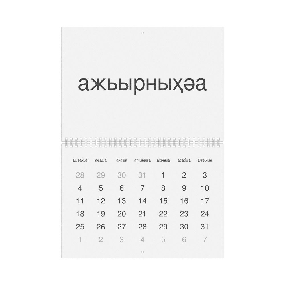 - Linguistics enthusiasts and polyglots - For "language geeks" interested in comparative linguistics or the mechanics of different languages and who value the aesthetic differences in scripts, orthography, and typography of different languages, the Abkhaz calendar serves as an object of intellectual interest. You can collect calendars for various languages to compare their linguistic roots (e.g., comparing Romance languages vs. Slavic languages). Leskoff's calendars are characterized by specific typographic choices that highlight the orthography and script unique to the target language. Think correct usage of diacritics, characters, and directional writing (left-to-right vs. right-to-left). The minimalist design focuses on legibility and aesthetic appeal of the script itself.