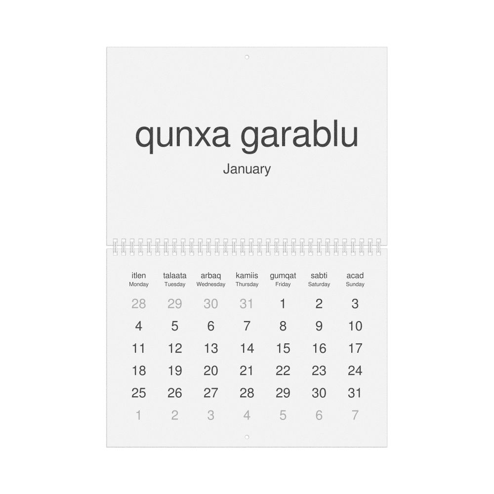 An Afar-language wall calendar (2027, Monday-start format) with English translations.