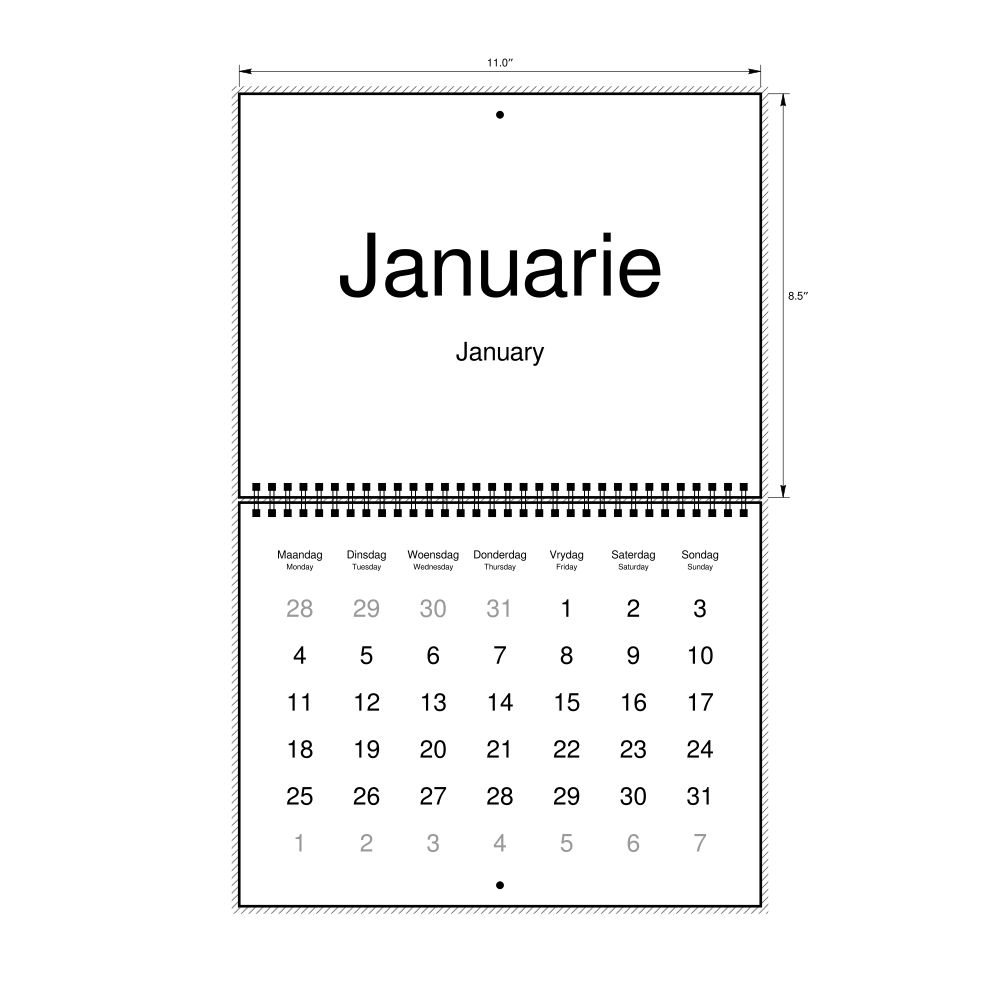2027 Wall CalendarAfrikaans/English-Labeled, Monday-Start Layout, Wire-Bound, 11 x 8.5 in (27.9 x 21.6 cm)