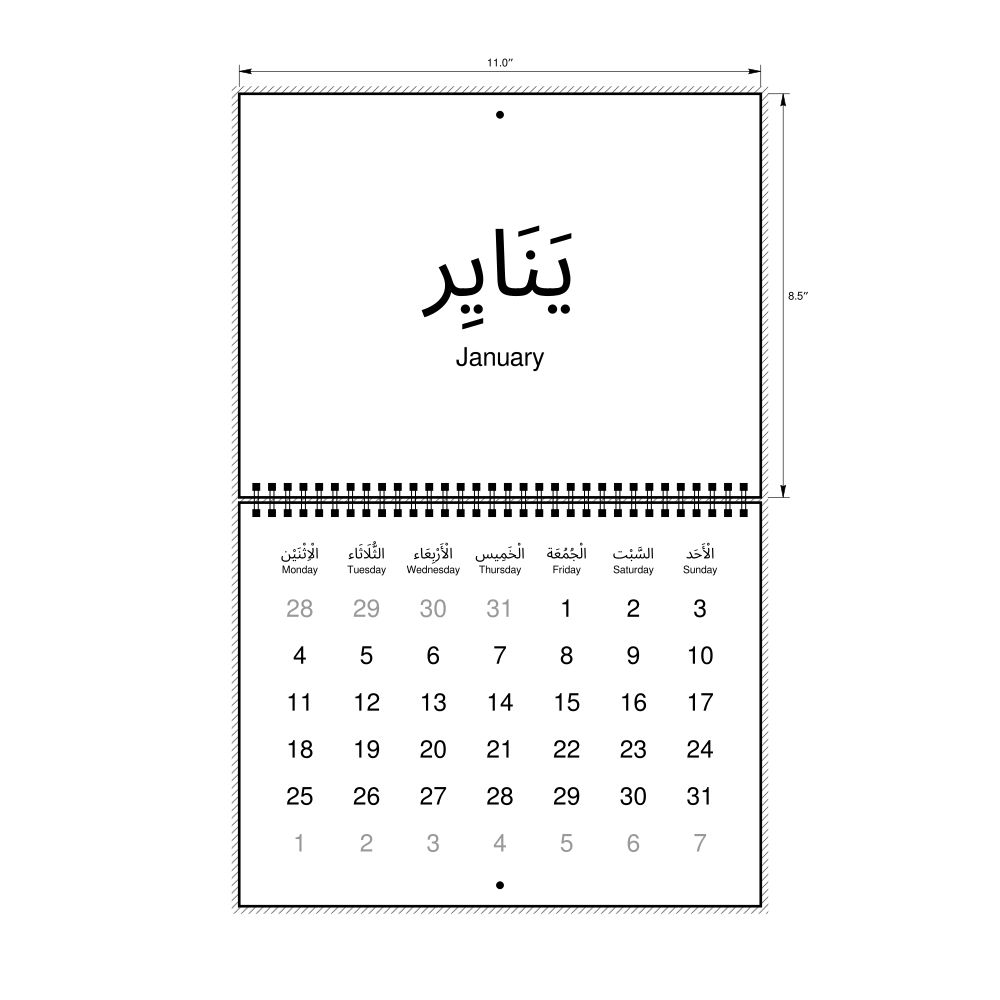2027 Wall CalendarArabic/English-Labeled, Monday-Start Layout, Wire-Bound, 11 x 8.5 in (27.9 x 21.6 cm)