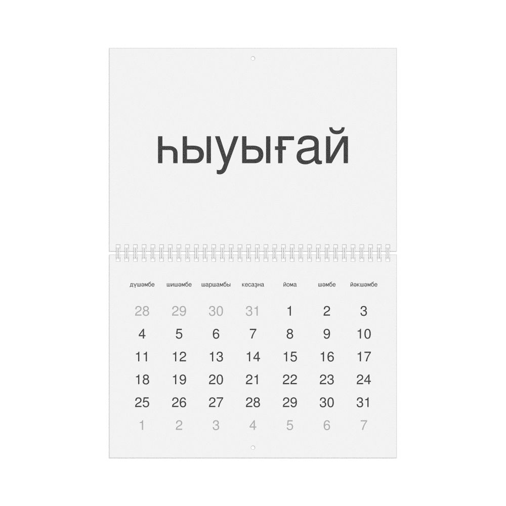 - Linguistics enthusiasts and polyglots - For "language geeks" interested in comparative linguistics or the mechanics of different languages and who value the aesthetic differences in scripts, orthography, and typography of different languages, the Bashkir calendar serves as an object of intellectual interest. You can collect calendars for various languages to compare their linguistic roots (e.g., comparing Romance languages vs. Slavic languages). Leskoff's calendars are characterized by specific typographic choices that highlight the orthography and script unique to the target language. Think correct usage of diacritics, characters, and directional writing (left-to-right vs. right-to-left). The minimalist design focuses on legibility and aesthetic appeal of the script itself.
