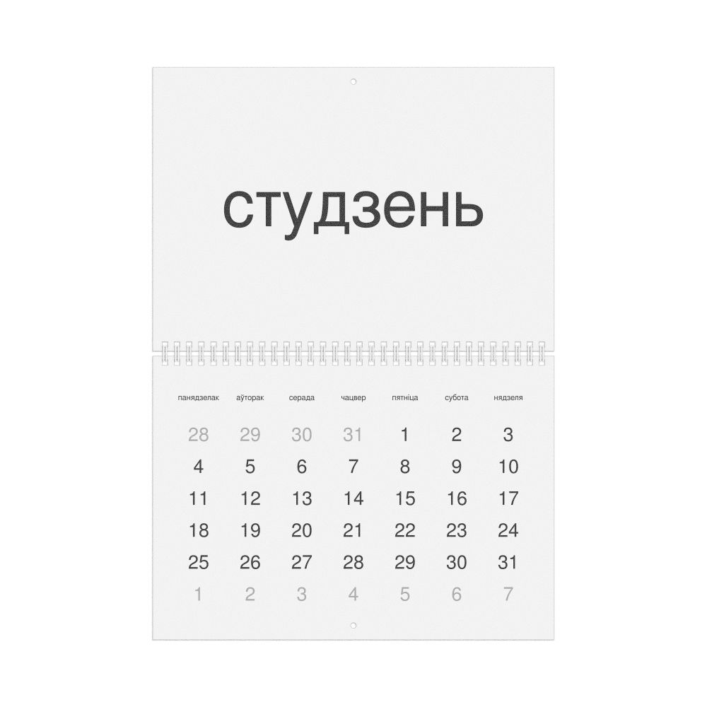 • Linguistics enthusiasts and polyglots - For "language geeks" interested in comparative linguistics or the mechanics of different languages and who value the aesthetic differences in scripts, orthography, and typography of different languages, the Belarusian calendar serves as an object of intellectual interest. You can collect calendars for various languages to compare their linguistic roots (e.g., comparing Romance languages vs. Slavic languages). Leskoff's calendars are characterized by specific typographic choices that highlight the orthography and script unique to the target language. Think correct usage of diacritics, characters, and directional writing (left-to-right vs. right-to-left). The minimalist design focuses on legibility and aesthetic appeal of the script itself.