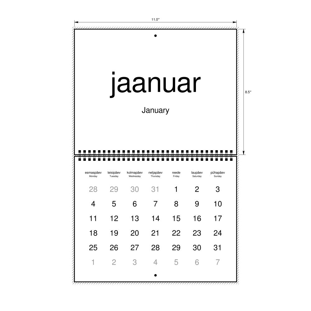 2027 Wall CalendarEstonian/English-Labeled, Monday-Start Layout, Wire-Bound, 11 x 8.5 in (27.9 x 21.6 cm)