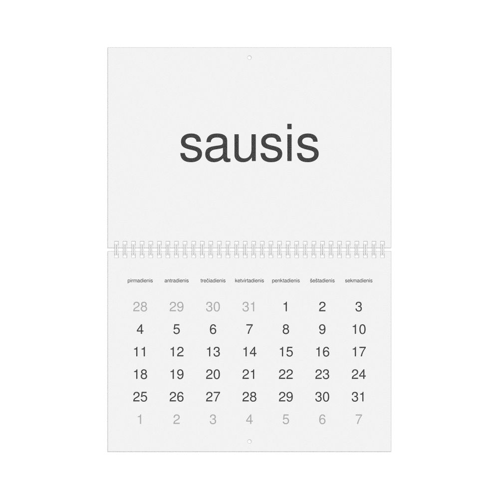 This calendar features the Lithuanian names of months and days of the week on top of a standard Gregorian calendar layout. Beyond its utility for tracking dates, it serves as an educational tool, cultural touchstone (cultural artifact), and functional decor (aesthetic object).