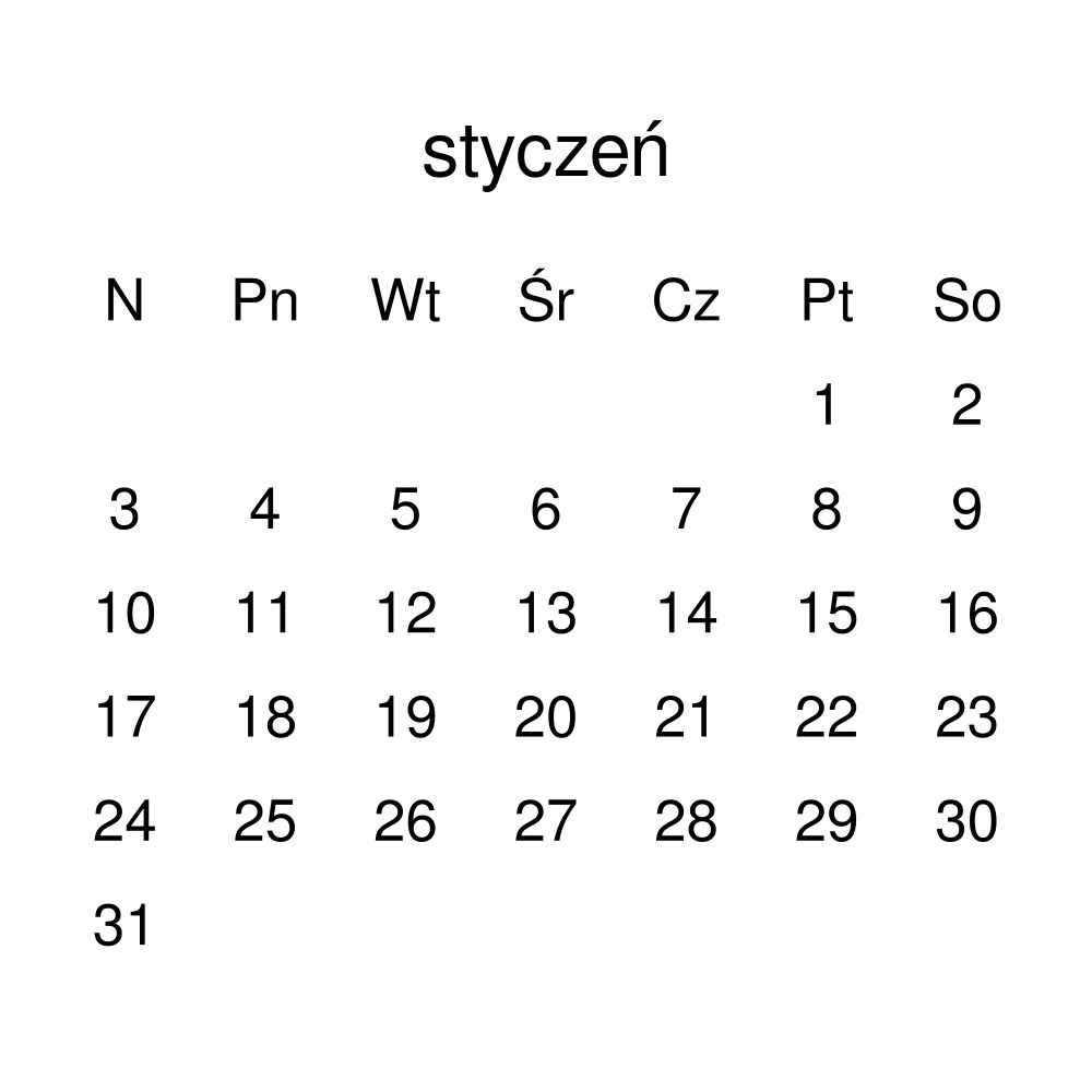 This calendar features the Polish names of months and days of the week on top of a standard Gregorian calendar layout. Beyond its utility for tracking dates, it serves as an educational tool, cultural touchstone (cultural artifact), and functional decor (aesthetic object).