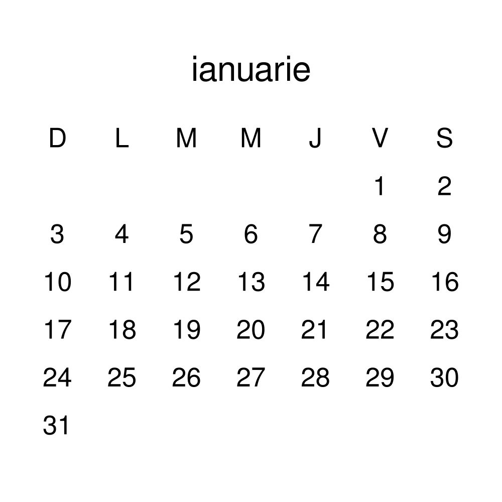 This calendar features the Romanian names of months and days of the week on top of a standard Gregorian calendar layout. Beyond its utility for tracking dates, it serves as an educational tool, cultural touchstone (cultural artifact), and functional decor (aesthetic object).