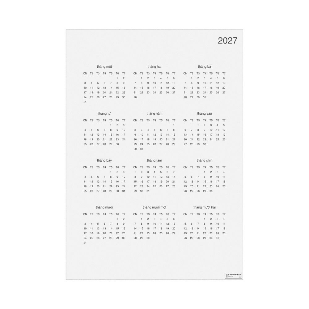 Leskoff 2027 Wall Calendar, Vietnamese-Labeled, Sunday-Start Layout, Poster / Wall Print, 23.4 x 33.1 in (59.4 x 84.1 cm), image 1 of 1