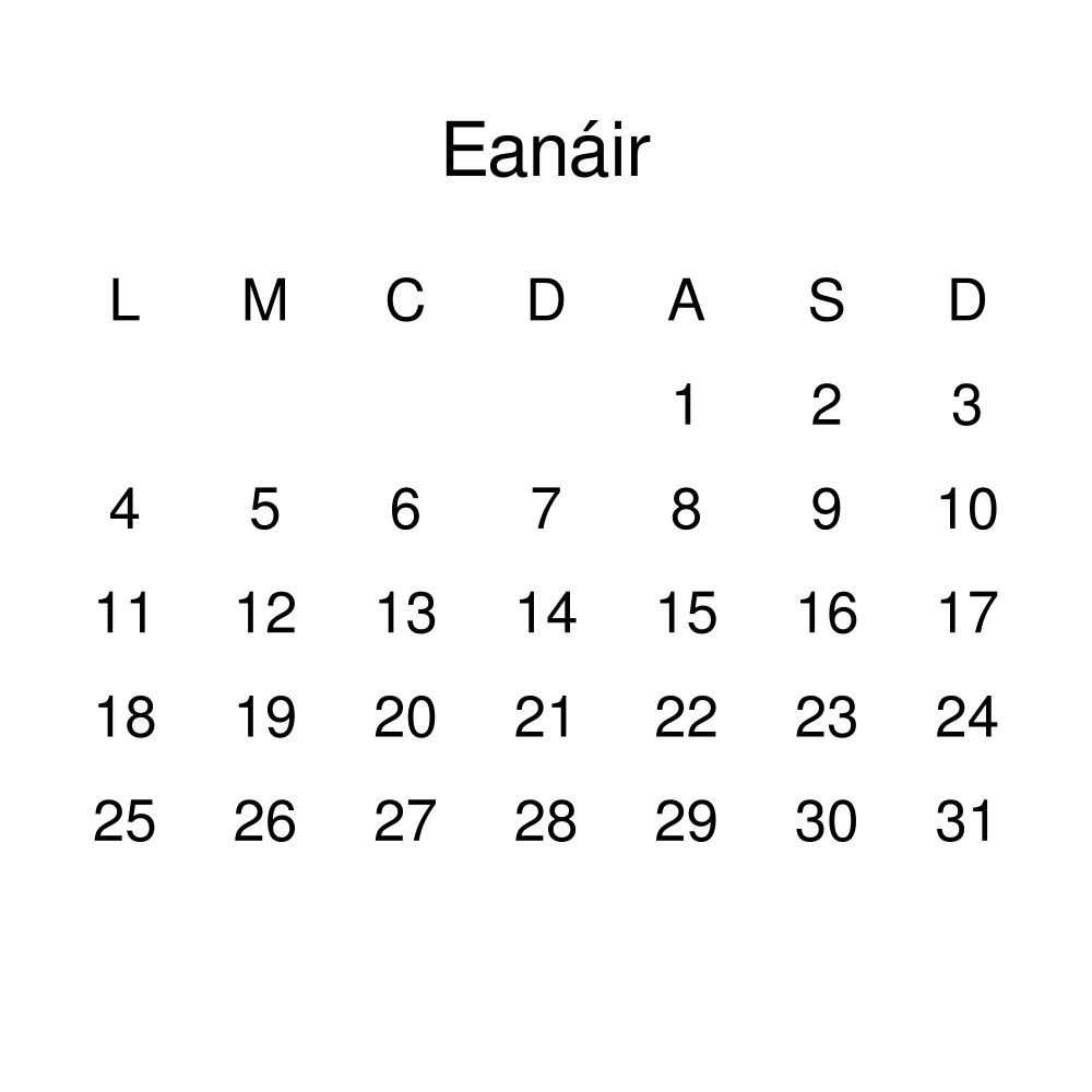 • Irish heritage speakers and cultural connectors - For individuals seeking to maintain a connection to their history, ancestral roots, or the culture associated with the Irish language, the calendar serves as a daily cultural marker. Use it in your home, office, library, or museum as a link to linguistic and cultural identity that integrates Irish into your everyday life. Familiar language script and naming conventions may also provide a sense of home in a foreign environment.