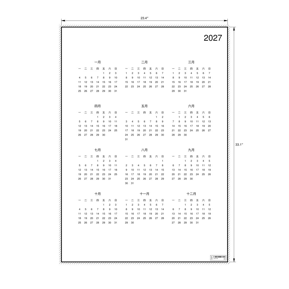 2027 Wall Calendar, Chinese-Labeled, Monday-Start Layout, Poster / Wall Print, 23.4 x 33.1 in (59.4 x 84.1 cm)