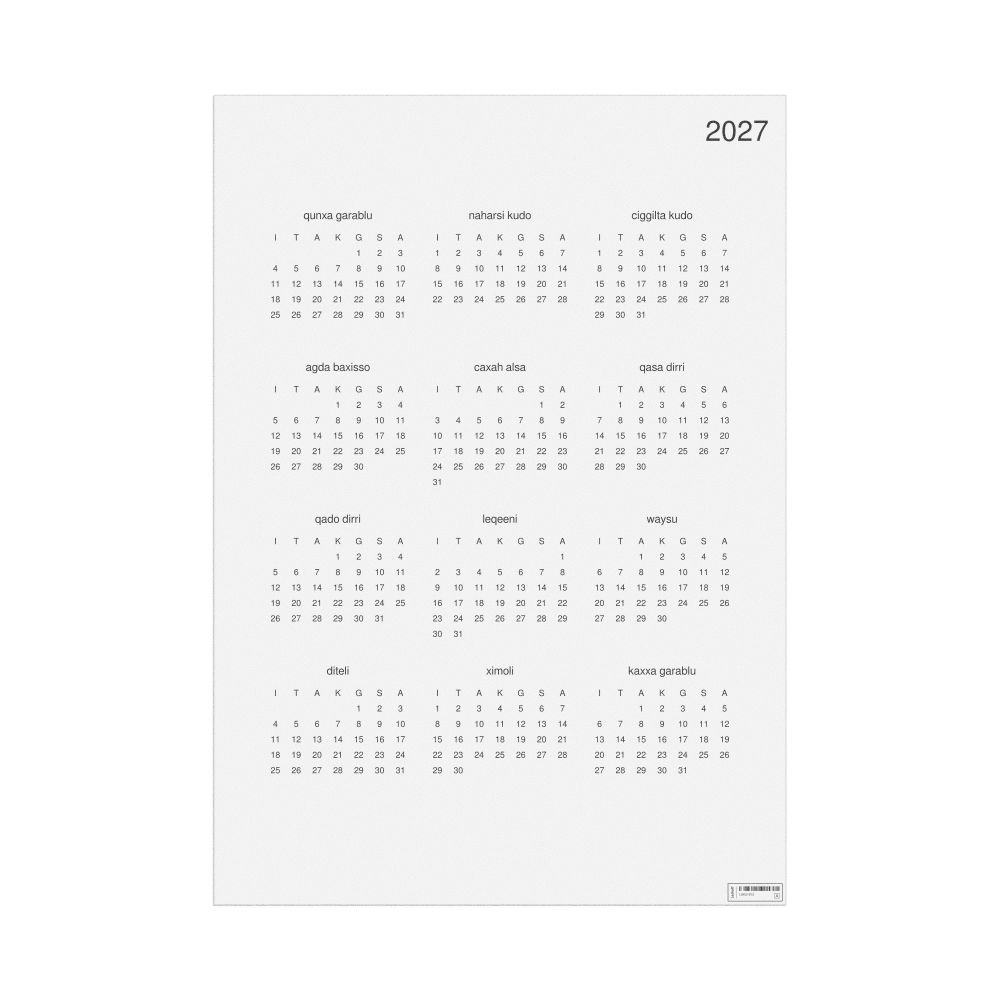 - Afar heritage speakers and cultural connectors - For individuals seeking to maintain a connection to their history, ancestral roots, or the culture associated with the Afar language, the calendar serves as a daily cultural marker. Use it in your home, office, library, or museum as a link to linguistic and cultural identity that integrates Afar into your everyday life. Familiar language script and naming conventions may also provide a sense of home in a foreign environment.