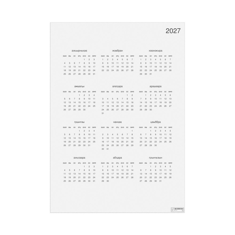 A 2027 wall calendar in Abkhaz. The calendar uses the Monday-start week format (common in the UK and Europe).