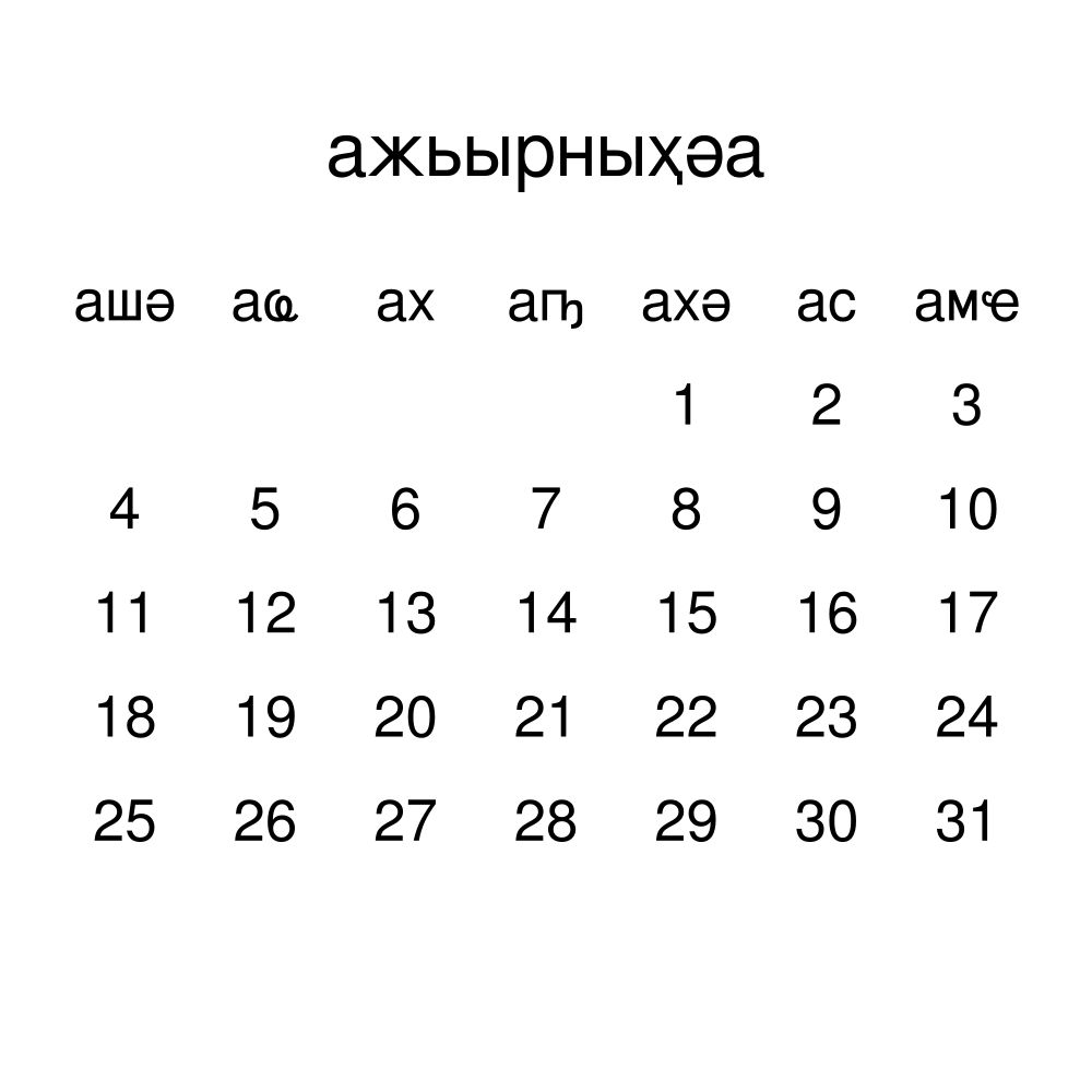 - Abkhaz speakers and enthusiasts - Choose this calendar if you are looking for a simple, localized calendar in the Abkhaz language. Use it in your home, office, or classroom as a regular calendar.
