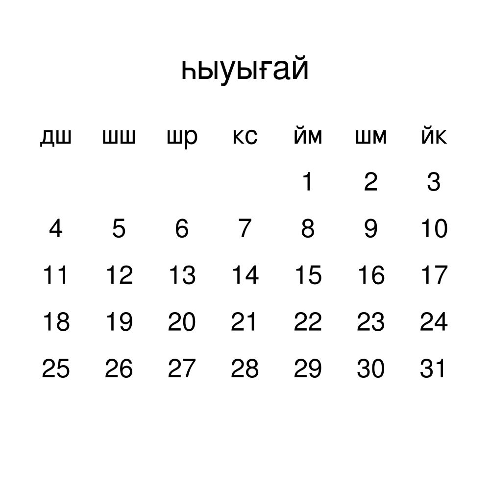 - Bashkir heritage speakers and cultural connectors - For individuals seeking to maintain a connection to their history, ancestral roots, or the culture associated with the Bashkir language, the calendar serves as a daily cultural marker. Use it in your home, office, library, or museum as a link to linguistic and cultural identity that integrates Bashkir into your everyday life. Familiar language script and naming conventions may also provide a sense of home in a foreign environment.