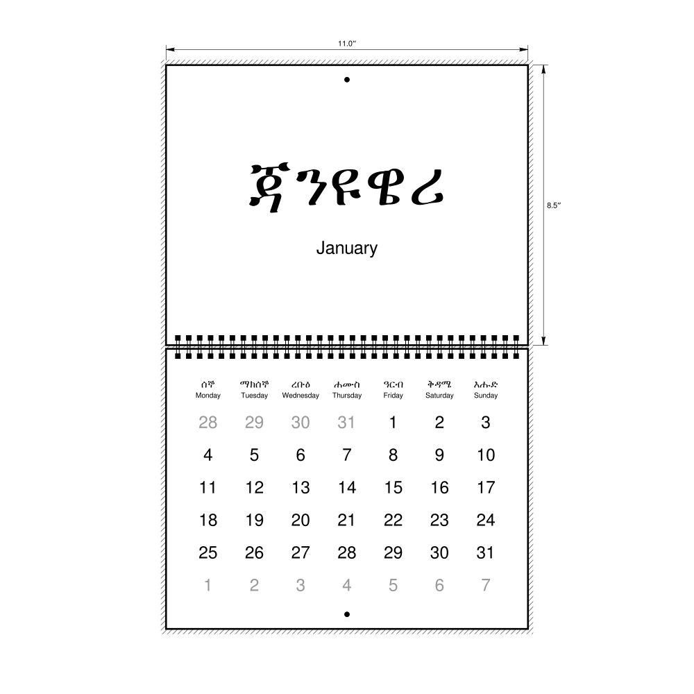 2027 Wall CalendarAmharic/English-Labeled, Monday-Start Layout, Wire-Bound, 11 x 8.5 in (27.9 x 21.6 cm)