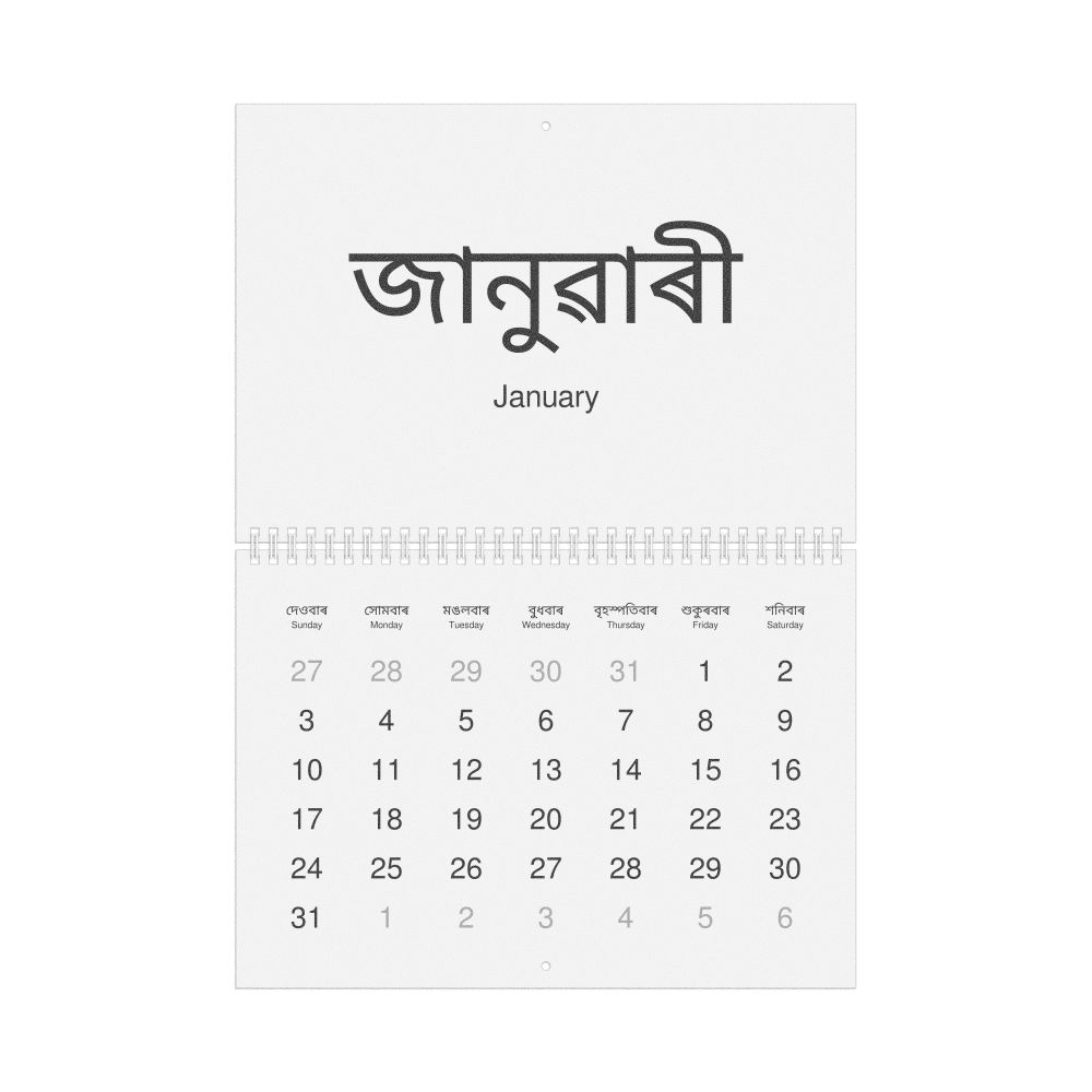 2026 Wall Calendar, Assamese/English-Labeled, Monday-Start Layout, Wire-Bound, 11.7 x 8.3 in (29.7 x 21.0 cm)
