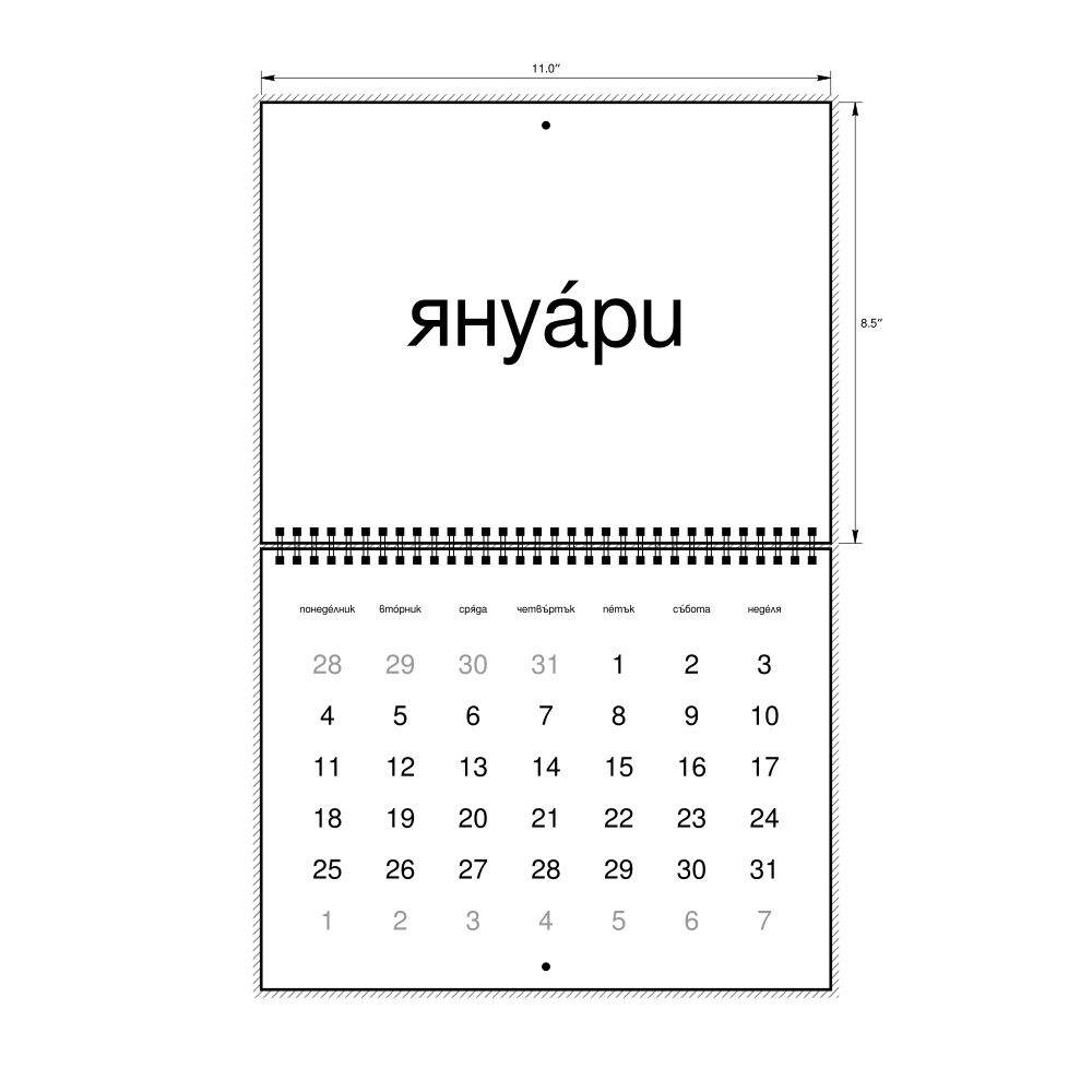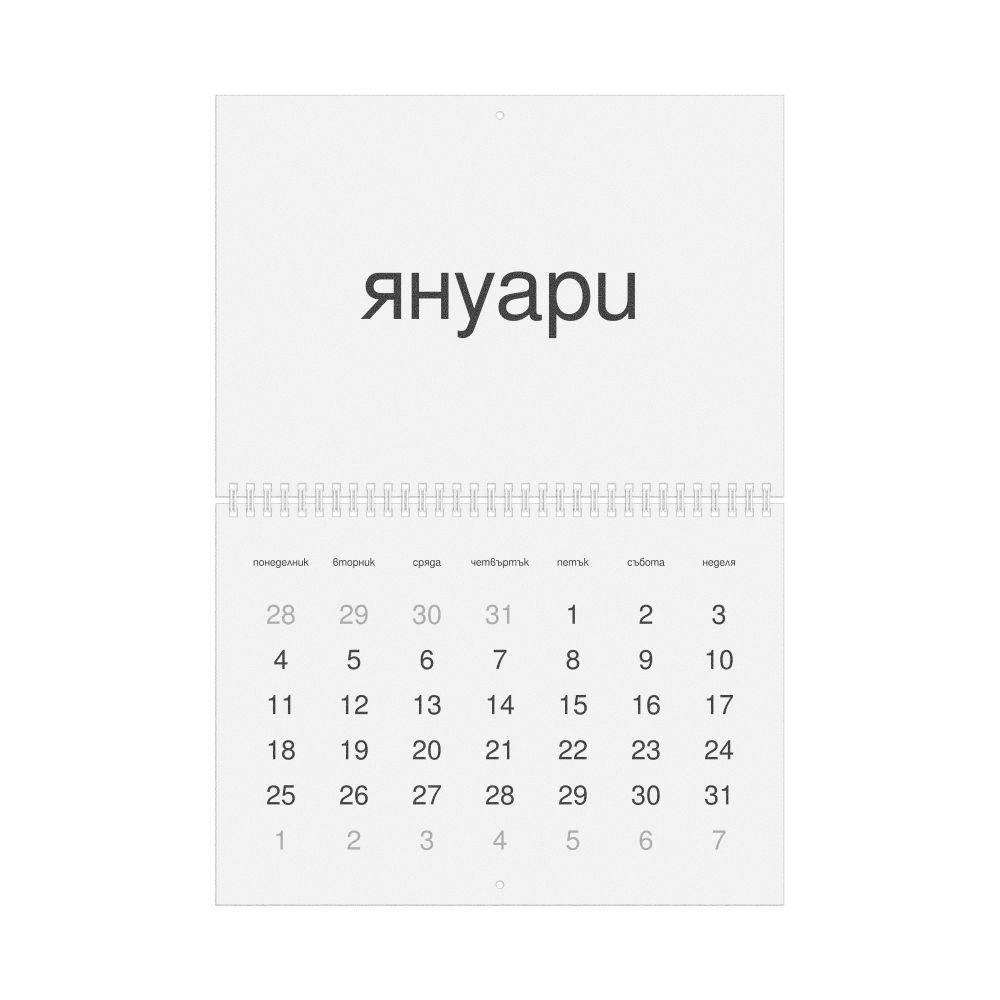 - Linguistics enthusiasts and polyglots - For "language geeks" interested in comparative linguistics or the mechanics of different languages and who value the aesthetic differences in scripts, orthography, and typography of different languages, the Bulgarian calendar serves as an object of intellectual interest. You can collect calendars for various languages to compare their linguistic roots (e.g., comparing Romance languages vs. Slavic languages). Leskoff's calendars are characterized by specific typographic choices that highlight the orthography and script unique to the target language. Think correct usage of diacritics, characters, and directional writing (left-to-right vs. right-to-left). The minimalist design focuses on legibility and aesthetic appeal of the script itself.
