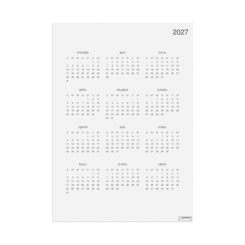- Linguistics enthusiasts and polyglots - For "language geeks" interested in comparative linguistics or the mechanics of different languages and who value the aesthetic differences in scripts, orthography, and typography of different languages, the Cherokee calendar serves as an object of intellectual interest. You can collect calendars for various languages to compare their linguistic roots (e.g., comparing Romance languages vs. Slavic languages). Leskoff's calendars are characterized by specific typographic choices that highlight the orthography and script unique to the target language. Think correct usage of diacritics, characters, and directional writing (left-to-right vs. right-to-left). The minimalist design focuses on legibility and aesthetic appeal of the script itself.