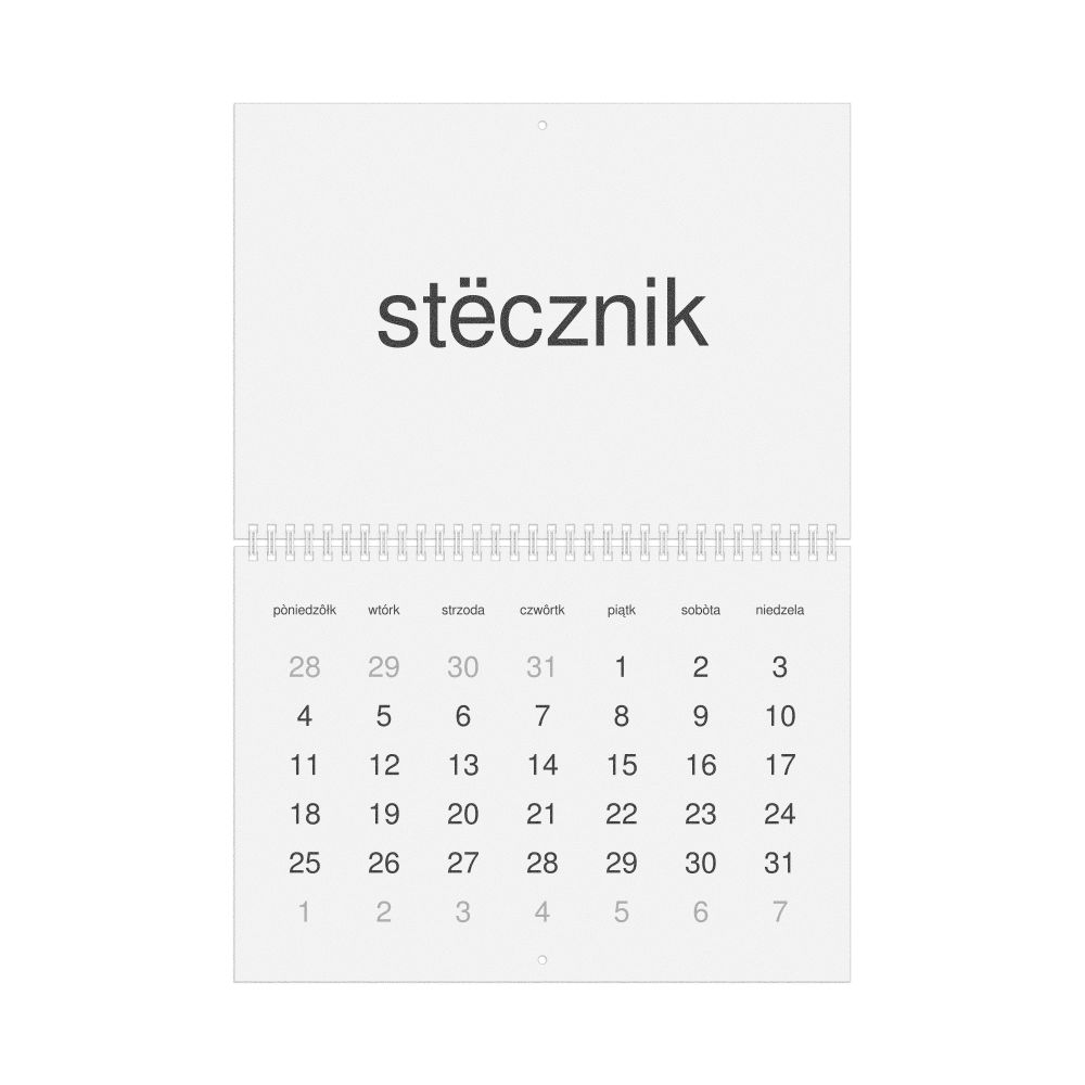 This calendar features the Kashubian names of months and days of the week on top of a standard Gregorian calendar layout. Beyond its utility for tracking dates, it serves as an educational tool, cultural touchstone (cultural artifact), and functional decor (aesthetic object).