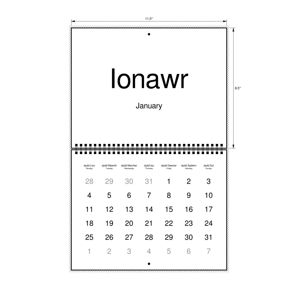 2027 Wall CalendarWelsh/English-Labeled, Monday-Start Layout, Wire-Bound, 11 x 8.5 in (27.9 x 21.6 cm)