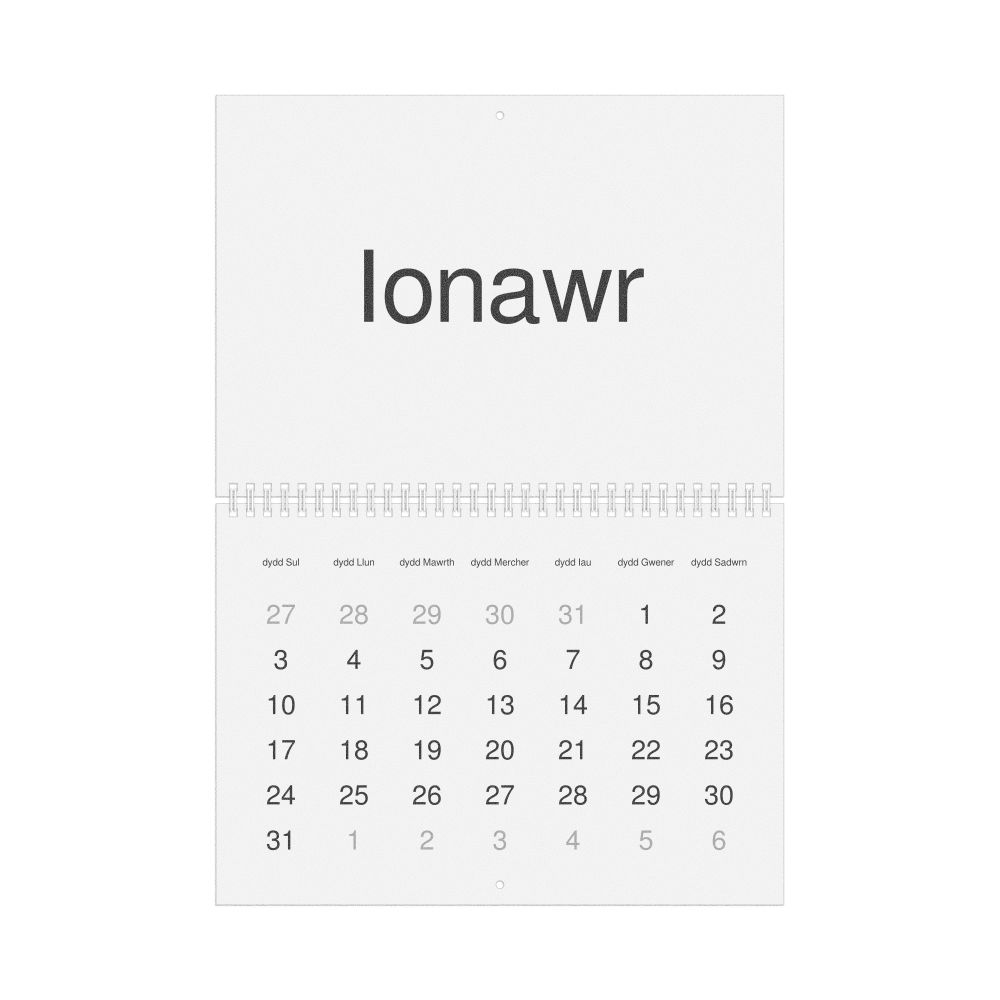 This calendar features the Welsh names of months and days of the week on top of a standard Gregorian calendar layout. Beyond its utility for tracking dates, it serves as an educational tool, cultural touchstone (cultural artifact), and functional decor (aesthetic object).