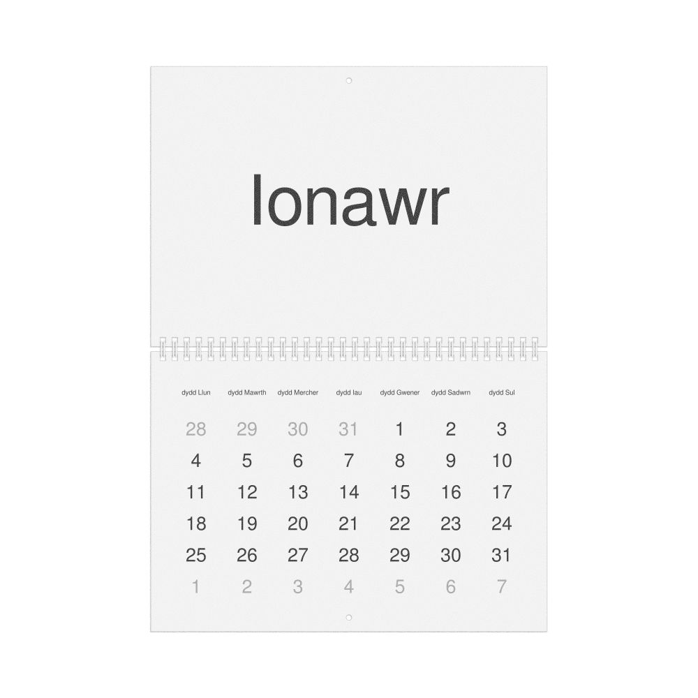 This calendar features the Welsh names of months and days of the week on top of a standard Gregorian calendar layout. Beyond its utility for tracking dates, it serves as an educational tool, cultural touchstone (cultural artifact), and functional decor (aesthetic object).