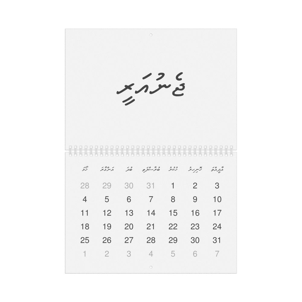 This calendar features the Maldivian names of months and days of the week on top of a standard Gregorian calendar layout. Beyond its utility for tracking dates, it serves as an educational tool, cultural touchstone (cultural artifact), and functional decor (aesthetic object).
