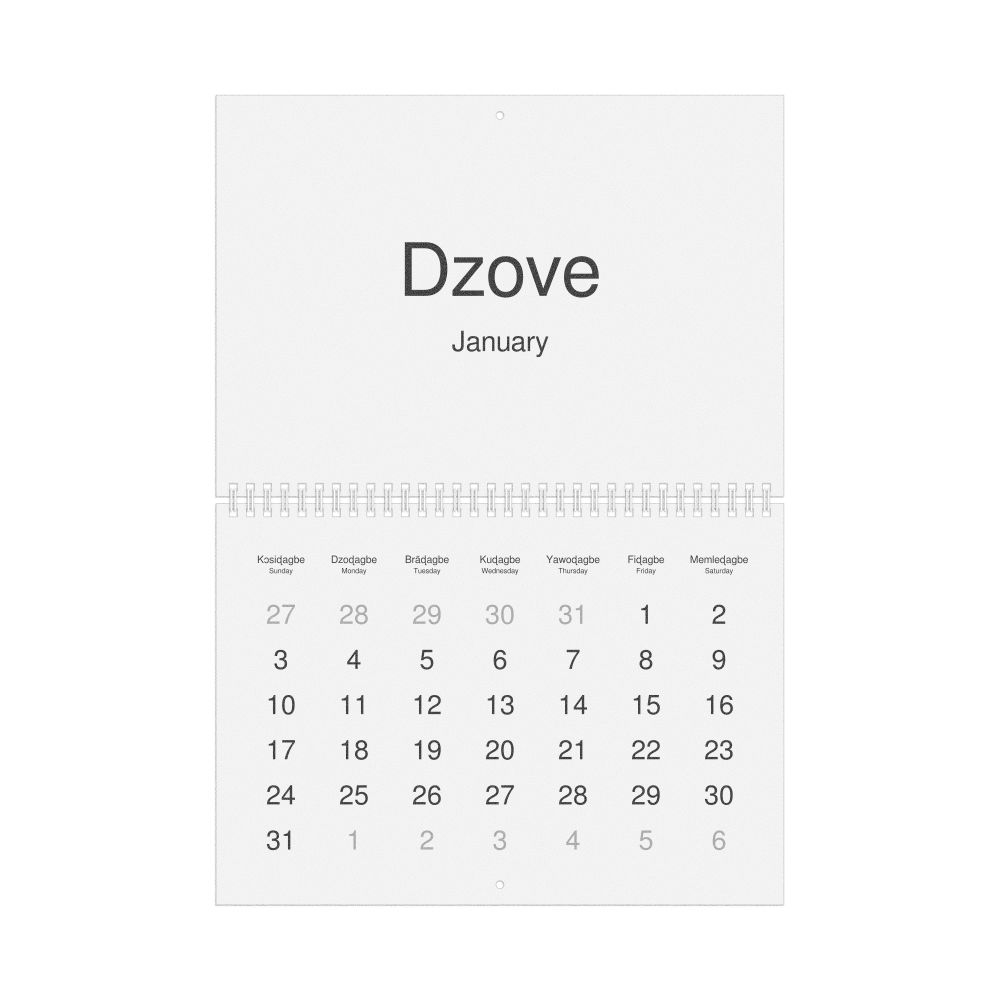 An Ewe-language wall calendar (2027, Sunday-start format) with English translations.