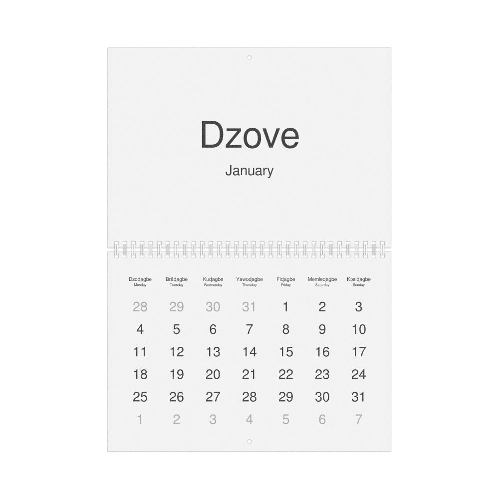 An Ewe-language wall calendar (2027, Monday-start format) with English translations.