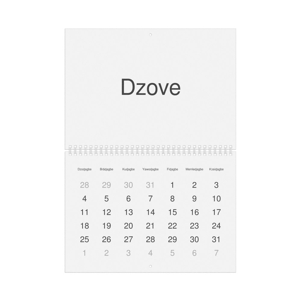 This calendar features the Ewe names of months and days of the week on top of a standard Gregorian calendar layout. Beyond its utility for tracking dates, it serves as an educational tool, cultural touchstone (cultural artifact), and functional decor (aesthetic object).