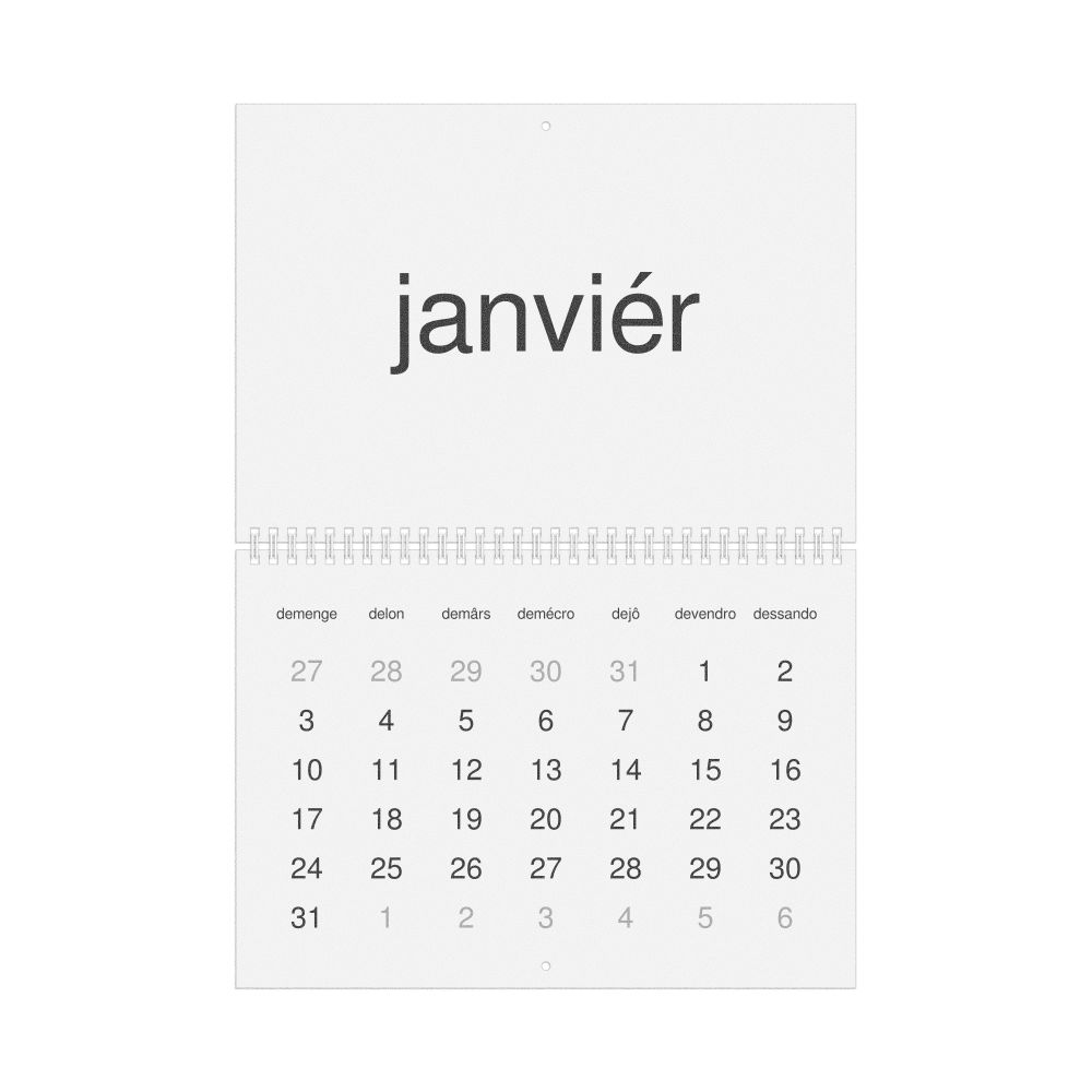 • Franco-Provençal heritage speakers and cultural connectors - For individuals seeking to maintain a connection to their history, ancestral roots, or the culture associated with the Franco-Provençal language, the calendar serves as a daily cultural marker. Use it in your home, office, library, or museum as a link to linguistic and cultural identity that integrates Franco-Provençal into your everyday life. Familiar language script and naming conventions may also provide a sense of home in a foreign environment.