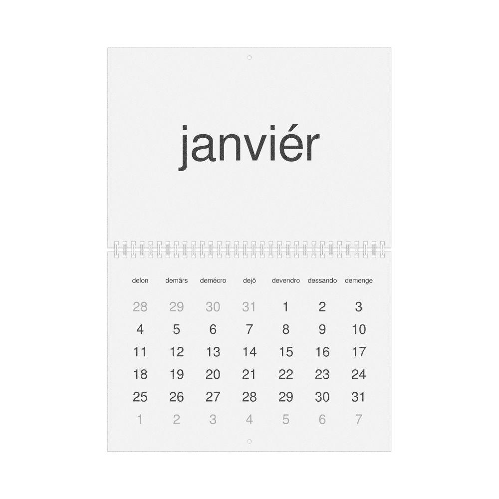 - Franco-Provençal heritage speakers and cultural connectors - For individuals seeking to maintain a connection to their history, ancestral roots, or the culture associated with the Franco-Provençal language, the calendar serves as a daily cultural marker. Use it in your home, office, library, or museum as a link to linguistic and cultural identity that integrates Franco-Provençal into your everyday life. Familiar language script and naming conventions may also provide a sense of home in a foreign environment.