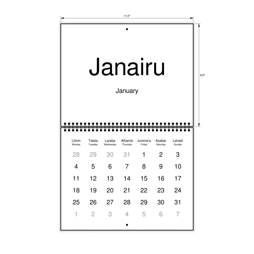 2027 Wall Calendar, Hausa/English-Labeled, Sunday-Start Layout, Wire-Bound, 11 x 8.5 in (27.9 x 21.6 cm)