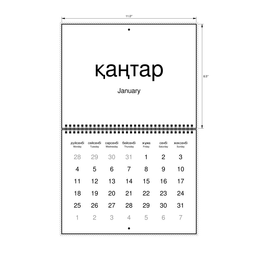 2027 Wall CalendarKazakh/English-Labeled, Monday-Start Layout, Wire-Bound, 11 x 8.5 in (27.9 x 21.6 cm)