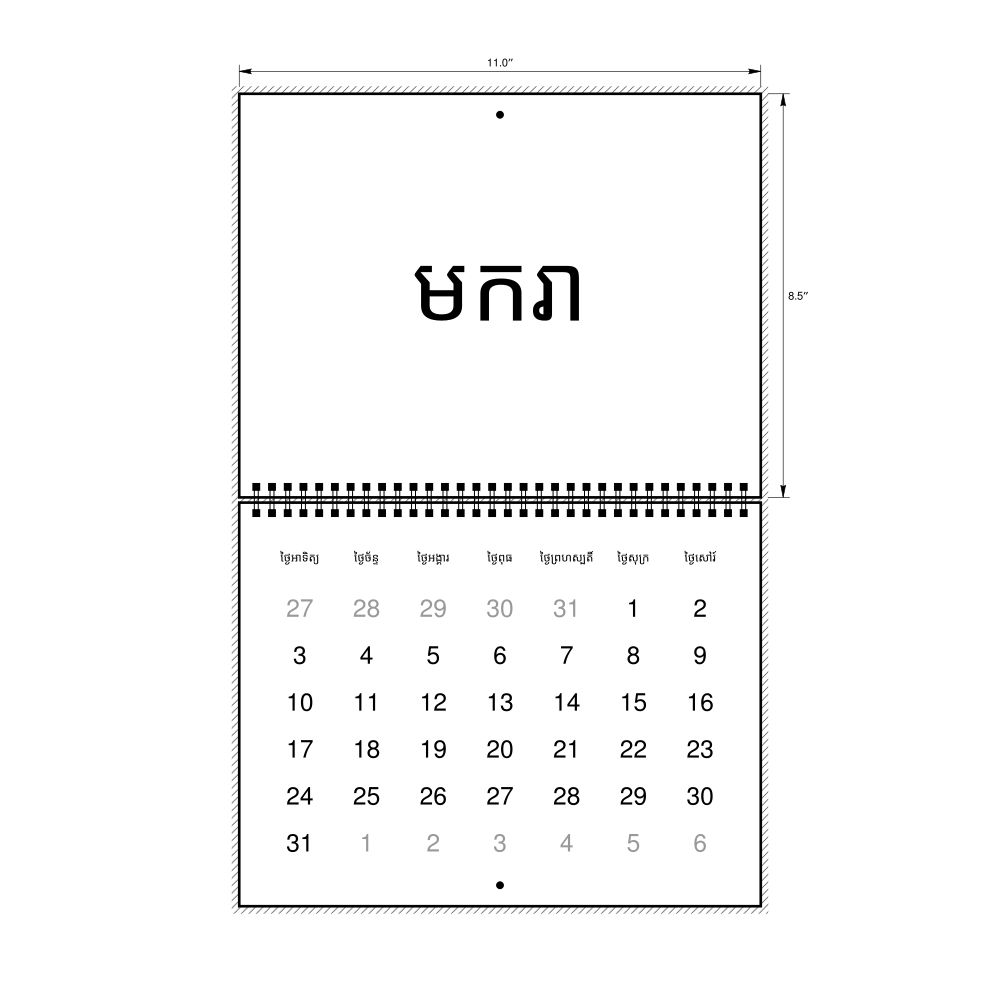 2027 Wall Calendar, Khmer-Labeled, Sunday-Start Layout, Wire-Bound, 11 x 8.5 in (27.9 x 21.6 cm)