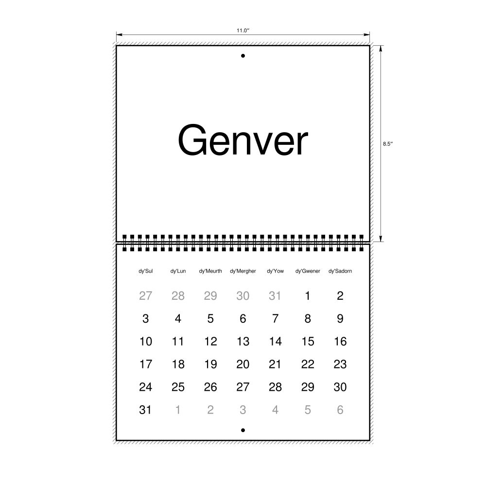 • Cornish heritage speakers and cultural connectors - For individuals seeking to maintain a connection to their history, ancestral roots, or the culture associated with the Cornish language, the calendar serves as a daily cultural marker. Use it in your home, office, library, or museum as a link to linguistic and cultural identity that integrates Cornish into your everyday life. Familiar language script and naming conventions may also provide a sense of home in a foreign environment.