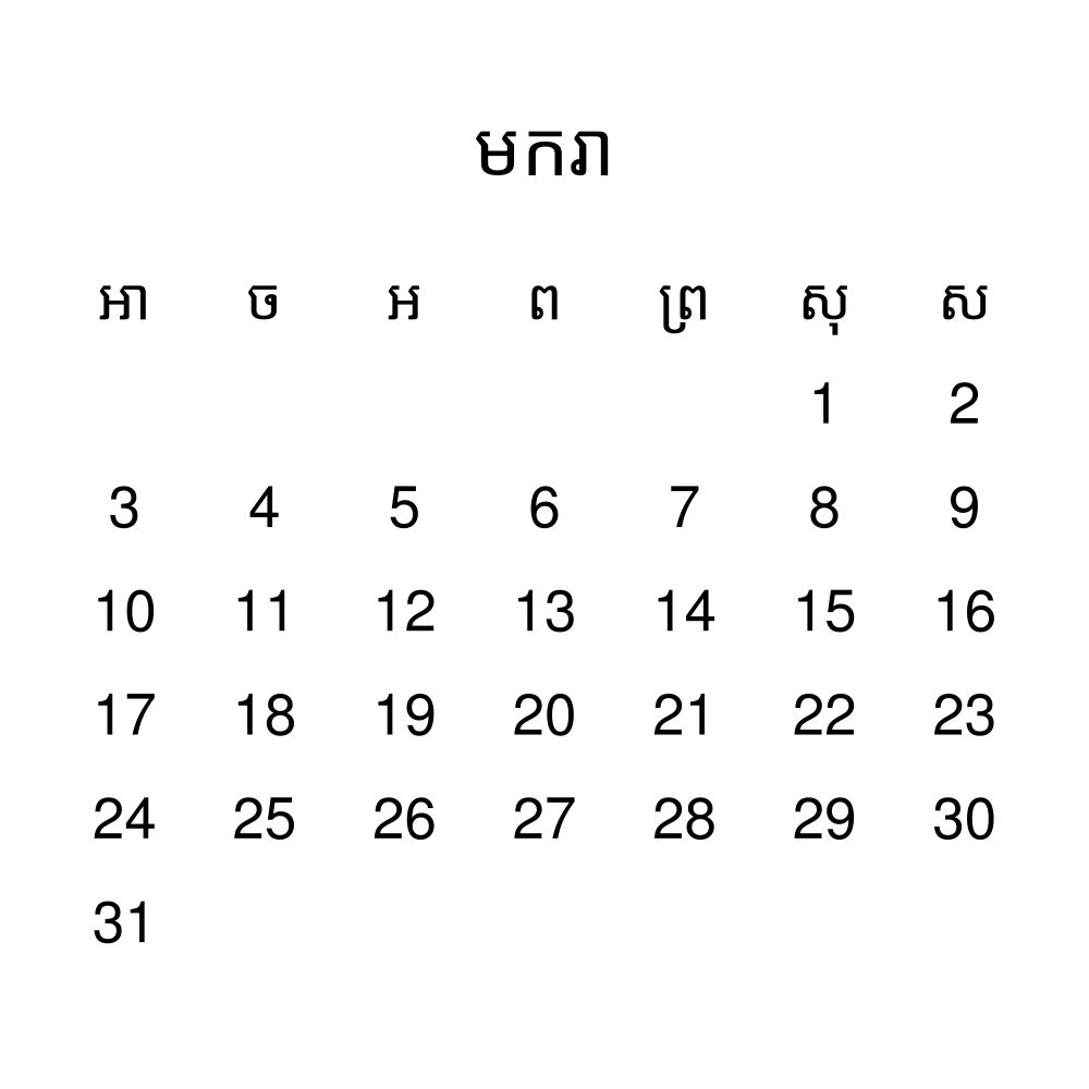 - Khmer heritage speakers and cultural connectors - For individuals seeking to maintain a connection to their history, ancestral roots, or the culture associated with the Khmer language, the calendar serves as a daily cultural marker. Use it in your home, office, library, or museum as a link to linguistic and cultural identity that integrates Khmer into your everyday life. Familiar language script and naming conventions may also provide a sense of home in a foreign environment.