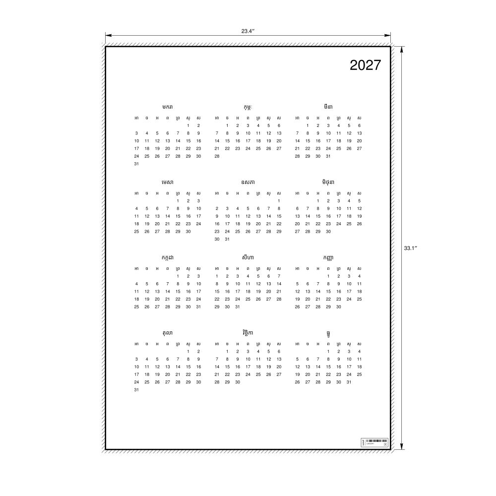 A 2027 wall calendar in Khmer. The calendar uses the Sunday-start week format (common in the US and Canada).