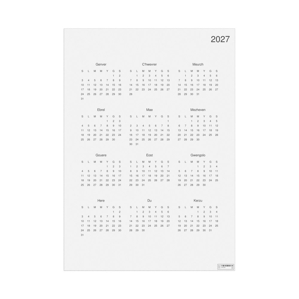 A 2027 wall calendar in Breton. The calendar uses the Sunday-start week format (common in the US and Canada).