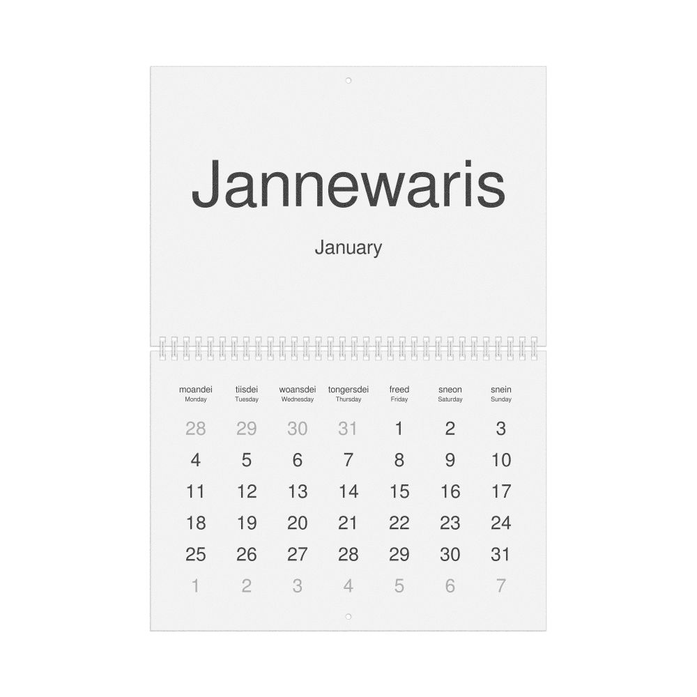 2026 Wall Calendar, West Frisian/English-Labeled, Sunday-Start Layout, Wire-Bound, 11.7 x 8.3 in (29.7 x 21.0 cm)