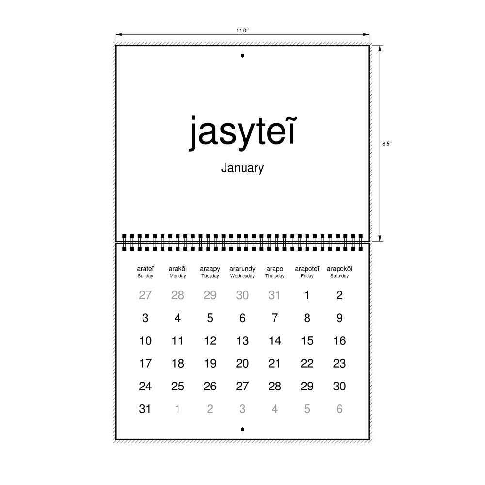 A Guarani-language wall calendar (2027, Sunday-start format) with English translations.