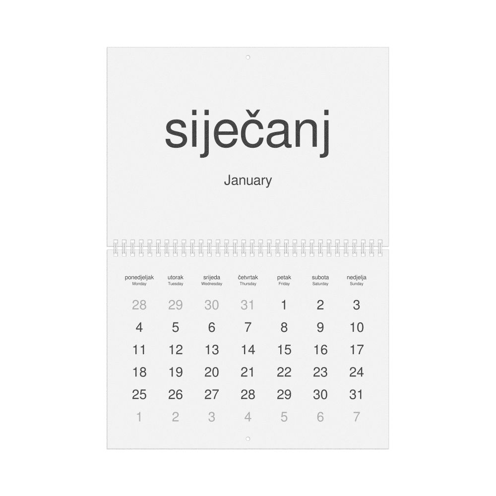 2027 Wall Calendar, Croatian/English-Labeled, Sunday-Start Layout, Wire-Bound, 11.7 x 8.3 in (29.7 x 21.0 cm)