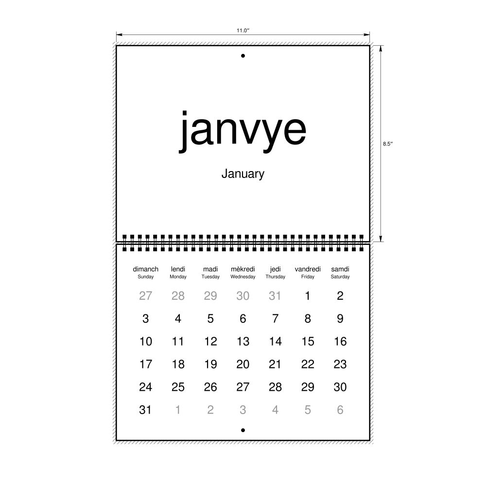 2027 Wall CalendarHaitian Creole/English-Labeled, Sunday-Start Layout, Wire-Bound, 11 x 8.5 in (27.9 x 21.6 cm)