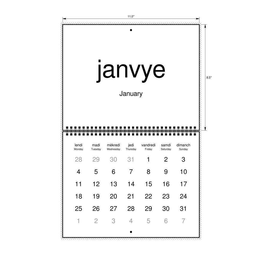 2027 Wall CalendarHaitian Creole/English-Labeled, Monday-Start Layout, Wire-Bound, 11 x 8.5 in (27.9 x 21.6 cm)