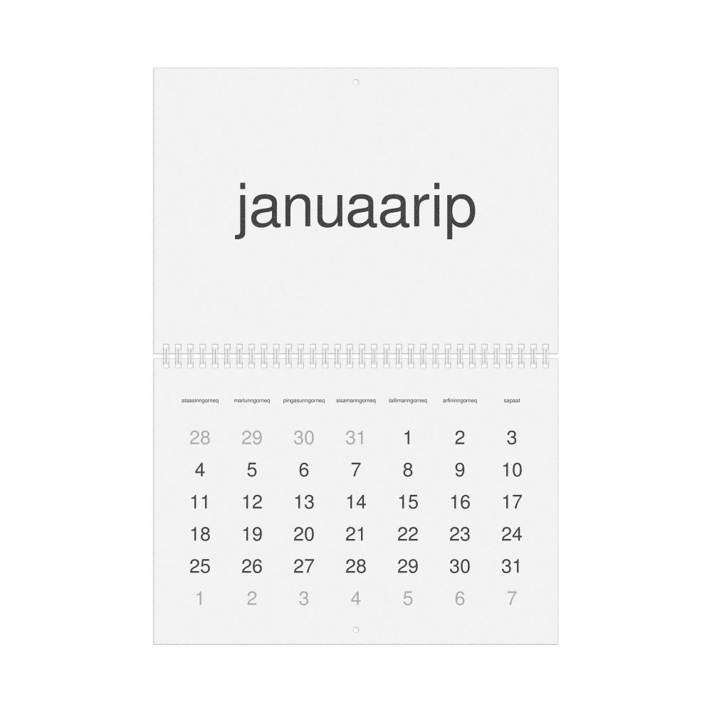 This calendar features the Greenlandic names of months and days of the week on top of a standard Gregorian calendar layout. Beyond its utility for tracking dates, it serves as an educational tool, cultural touchstone (cultural artifact), and functional decor (aesthetic object).