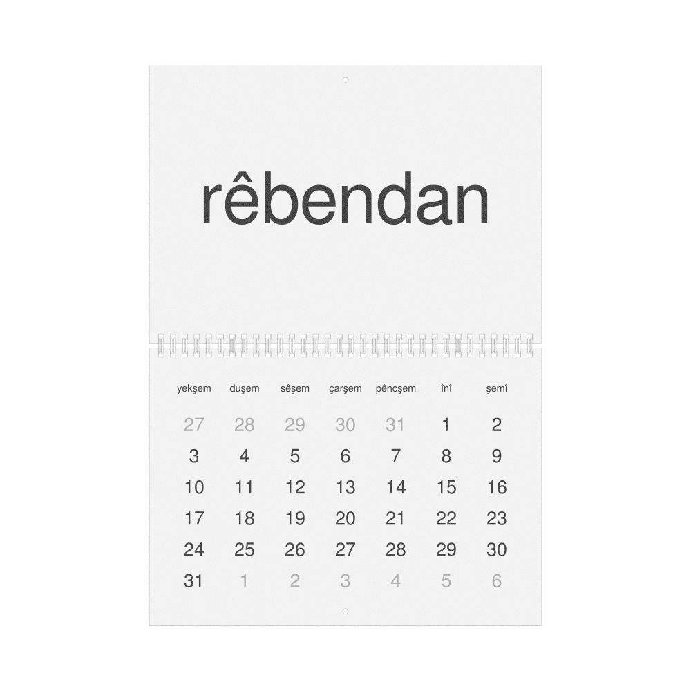 This calendar features the Kurdish names of months and days of the week on top of a standard Gregorian calendar layout. Beyond its utility for tracking dates, it serves as an educational tool, cultural touchstone (cultural artifact), and functional decor (aesthetic object).