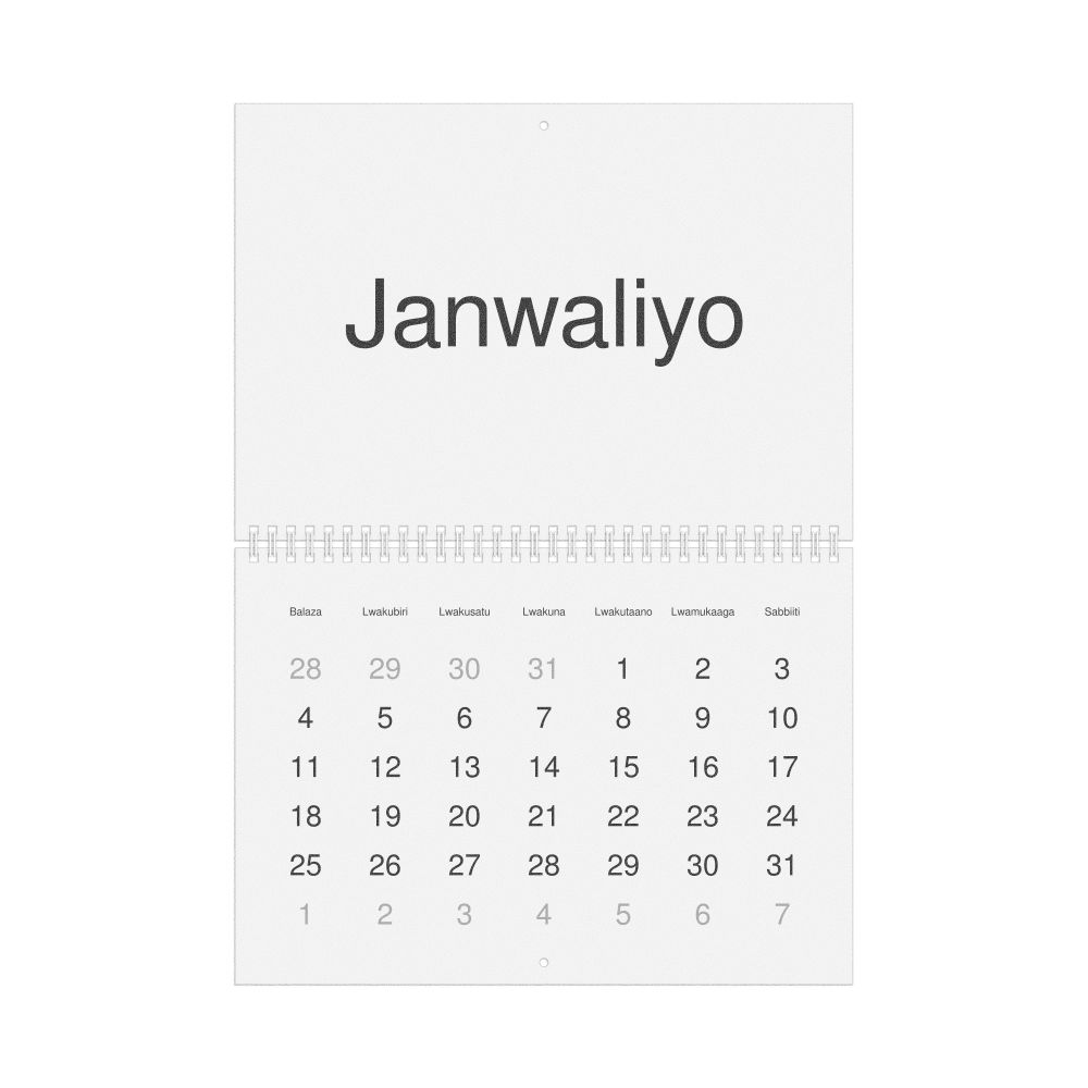 - Luganda heritage speakers and cultural connectors - For individuals seeking to maintain a connection to their history, ancestral roots, or the culture associated with the Luganda language, the calendar serves as a daily cultural marker. Use it in your home, office, library, or museum as a link to linguistic and cultural identity that integrates Luganda into your everyday life. Familiar language script and naming conventions may also provide a sense of home in a foreign environment.