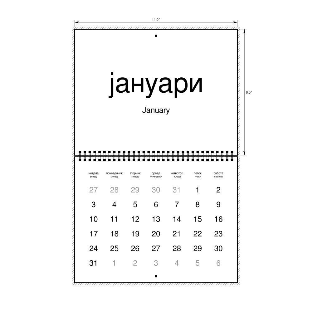 2027 Wall CalendarMacedonian/English-Labeled, Sunday-Start Layout, Wire-Bound, 11 x 8.5 in (27.9 x 21.6 cm)