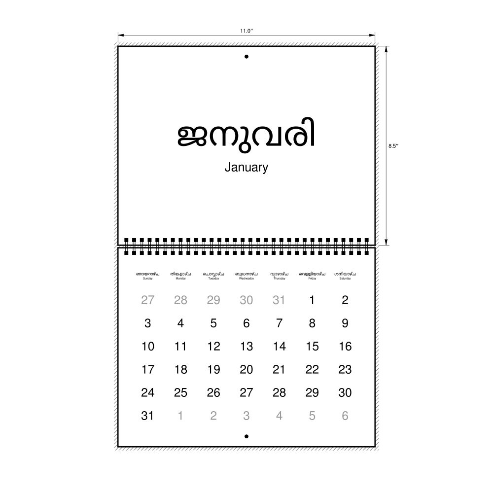2026 Wall Calendar, Malayalam-Labeled, Sunday-Start Layout, Wire-Bound, 11 x 8.5 in (27.9 x 21.6 cm)